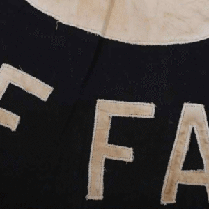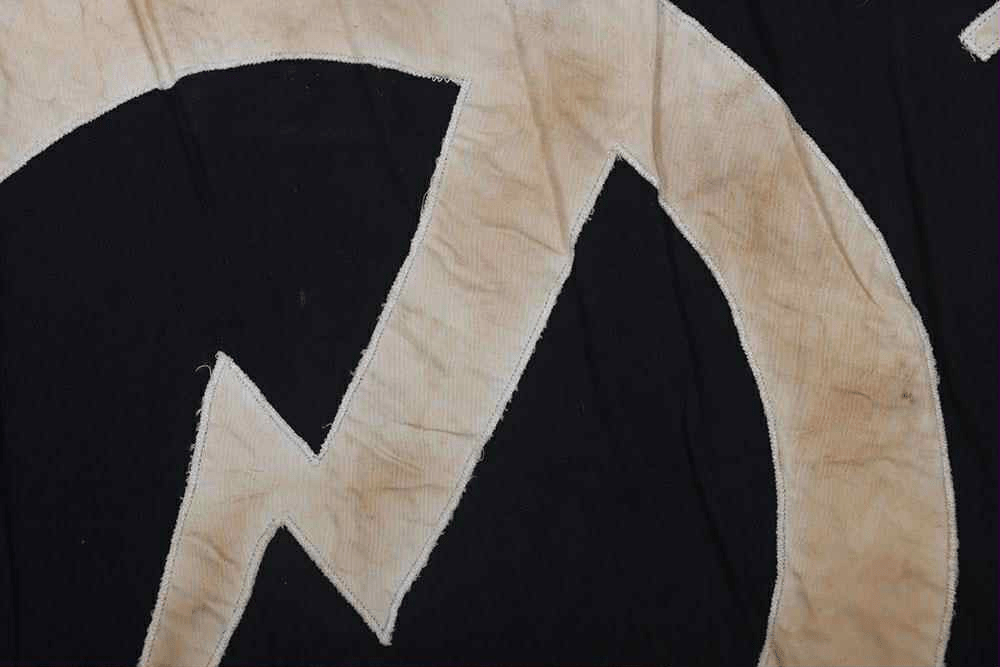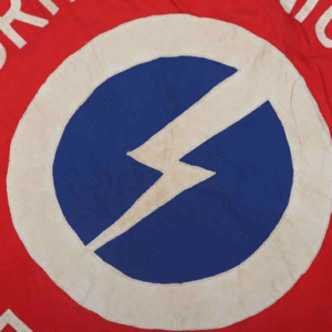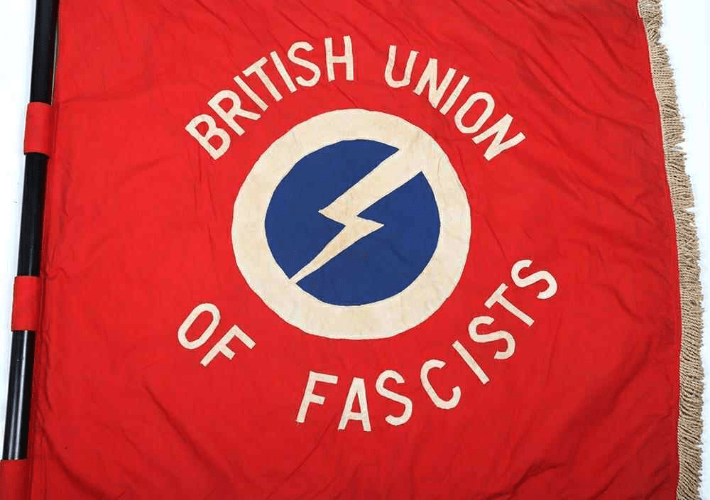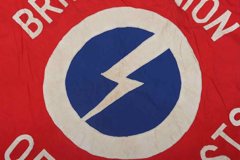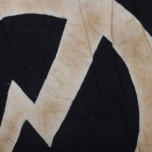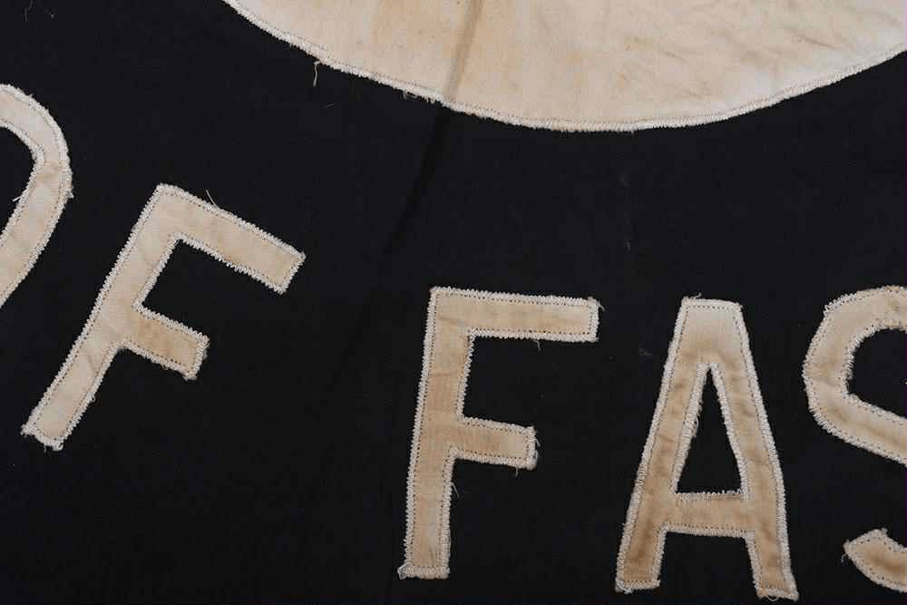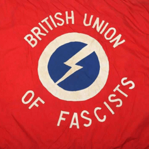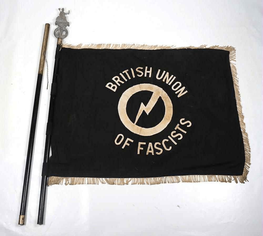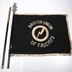 1930’s Oswald Mosley British Union of Fascists (B.U.F) Banner / Standard, interesting large double sided cloth banner flag for the British 1930’s political party. The red cloth flag has large single lightning bolt emblem to the centre and around ‘BRITISH UNION OF FASCISTS’ to both sides. Cream twist cord fringing to three edges of the flag. Cloth tabs to one edge which are mounted onto original two piece poles with alloy figure of Britannia to the top. Flag measures 93 x 84cms (not including fringing)