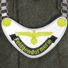 These gorgets were worn by members of the Feldjagerkorps, to make themselves instantly recognisable. This was achieved through the use of luminescent paint on the eagle, text and buttons, which allowed them to be spotted quickly in either day or night. These police gorgets have a multi-piece construction, and are made from metal with a field grey backing on the reverse. They also come with the accompanying chain, and have been finished in a luminescent yellow paint, just like the originals.